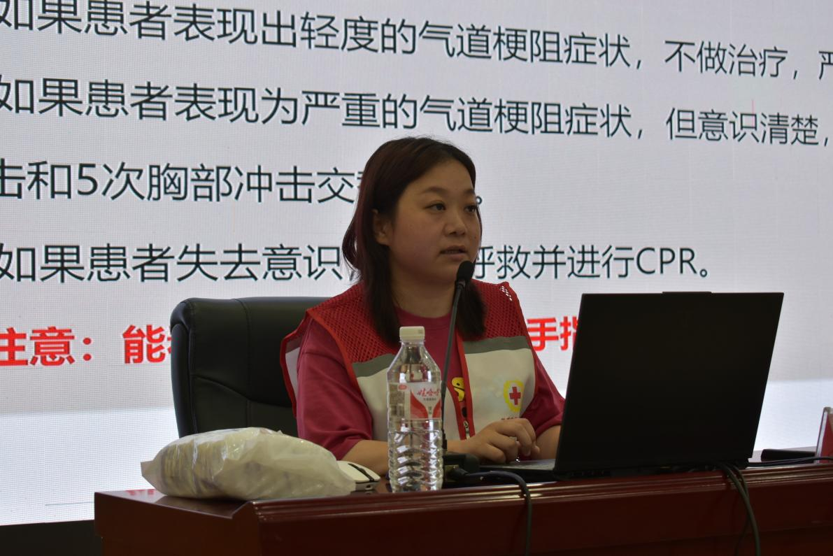 我校护理学院团总支书记、“护” 你平安应急救护志愿服务队负责人唐凌霎老师,以日常生活中常见的突发状况为切入点,重点围绕气道异物梗阻、心肺复苏(CPR)、创伤救护等急救措施的核心原理展开讲解。为增强教学的直观性,唐老师带领志愿服务队队员进行分步骤、全流程的规范演示—— 从判断患者意识状态、评估现场环境安全,到实施胸外按压、人工呼吸及 AED(自动体外除颤器)操作,每一个关键环节都讲解得细致入微,将抽象的急救知识转化为清晰易懂的实操指南。