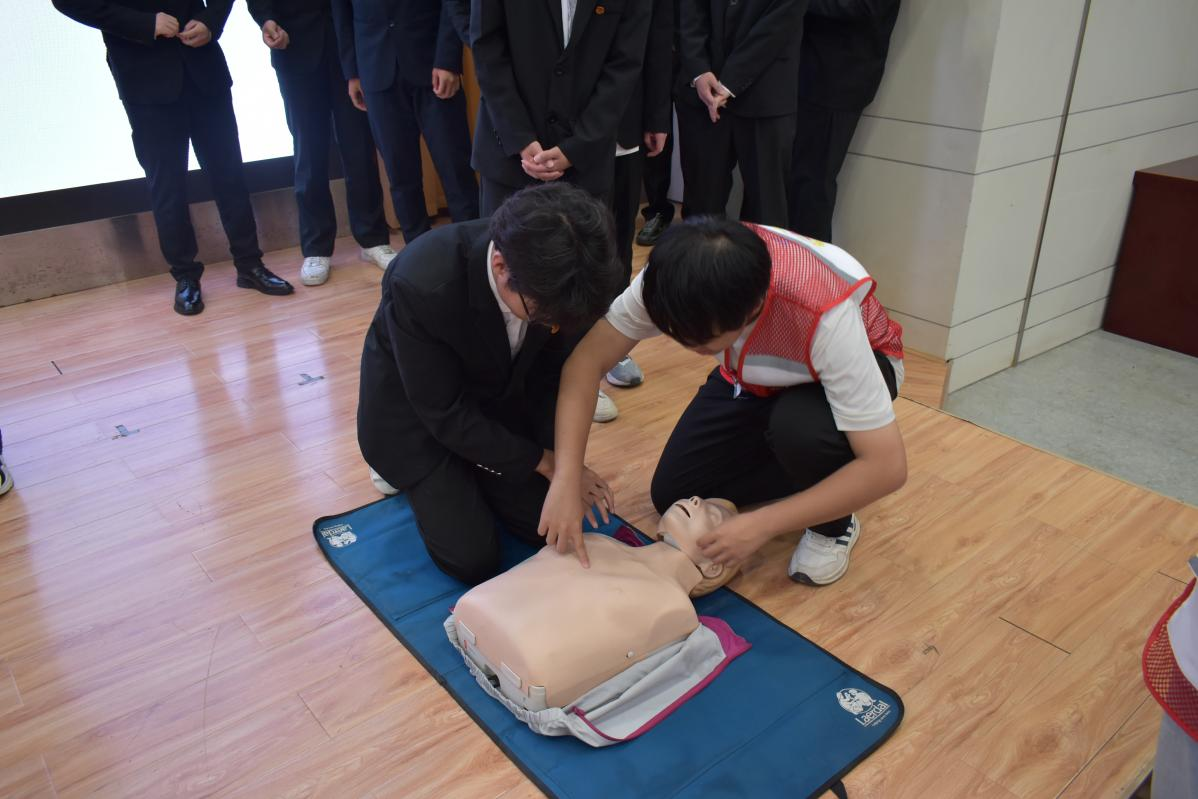 在模拟演练环节,学员们化身“急救小能手”,分组围在模拟人旁开展实操训练。在唐老师及志愿服务队队员的一对一指导下,大家认真练习胸外按压的力度与频率、海姆立克急救法的冲击部位选择、创伤包扎的规范流程等技能,并结合模拟场景相互交流操作心得。现场气氛热烈,学员们专注的神情与规范的动作,展现出对急救知识的重视与积极学习的态度。