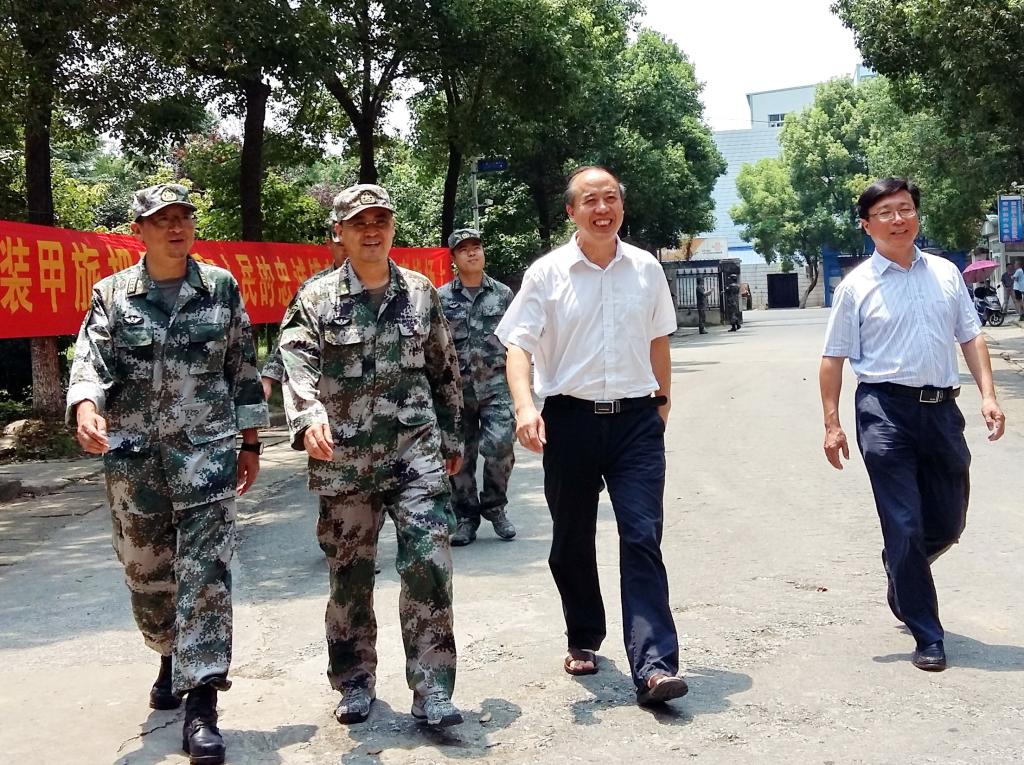 7月26日上午,中部战区某军副军长王继平少将来我校慰问驻校的防汛部队子弟兵,盛赞学校后勤服务工作细致周到、贴心入微。省军区副司令员黄义敏大校,孝感市市长助理万忠鑫带领市防汛办负责人,学校党委书记蔡诗红、副书记张勇等领导陪同慰问。