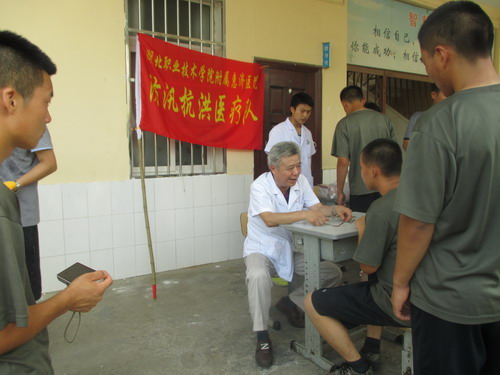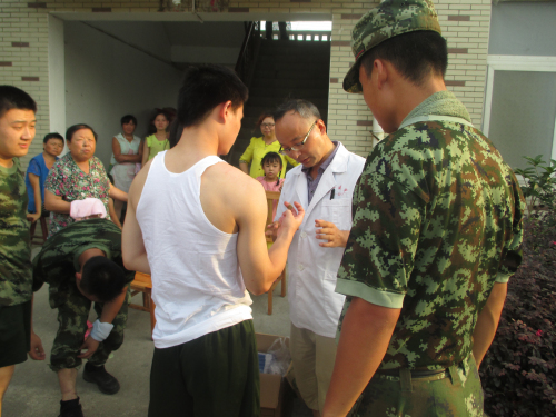 7月27日,学校附属惠济医院负责人孙国运带领皮肤专家余念文等一行八人,来到孝感临空经济开发区开展送医送药义诊活动,为受灾群众、抗洪部队官兵送去了贴心的关怀。医疗服务队先后来到闵集中学灾民安置点、闵集小学某铁甲旅驻地、马溪小学省武警总队驻地,为200多名群众、500多名抗洪部队官兵开展了皮肤病的诊疗、咨询和宣传等工作,累计发放皮肤外用药品1000余瓶支,口服药品200余盒。