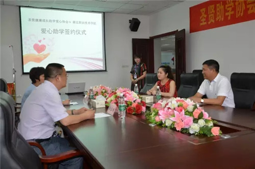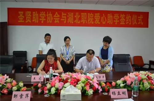 6月15日,湖北职业技术学院与孝感市圣贤健康成长助学爱心协会签订爱心助学协议。湖北职业技术学院副校长杨立明、学工处副处长兼学生资助中心主任邹雪萍,孝感市圣贤健康成长助学爱心协会会长张洪涛、秘书长王慈出席签约仪式。