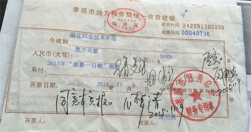 2015年10月16日,学校工会根据市政府“慈善一日捐”通知精神,以“伸援手,救急难”为主题,以“慈心为民、善举济世、以人为本、为民解困”为宗旨,组织全体工会会员献爱心,共收到教职工595人捐款44680元。另收到农工党湖北职院支部14人捐款1200元。总计捐款人数为609人,捐款金额45880元。根据财经纪律,工会将所有捐款存入学校账户监管。上述捐款上缴10000元孝感市慈善总会,余下捐款学校将分步骤、分阶段用于精准扶贫点。