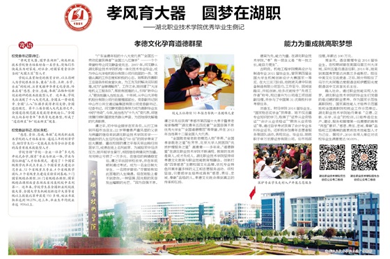 “孝风育大器,圆梦在湖职”,湖北职业技术学院努力培养好每一名学生,使他们尽快成长为对家庭、对社会、对国家有责任担当的“大国工匠”型人才。