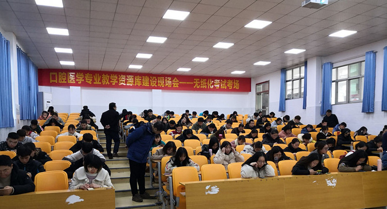 会前,专家组一行到现场巡视了2018级口腔医学专业无纸化考试考场。400多名学生参加了此次考试,考生们认真的答题,考场秩序井然,教室的大屏幕上显示每个考生的答题状态。考前一周对考生进行了无纸化试题训练,确保考试环节顺利无误,无纸化考试是资源库建设应用的重要部分。