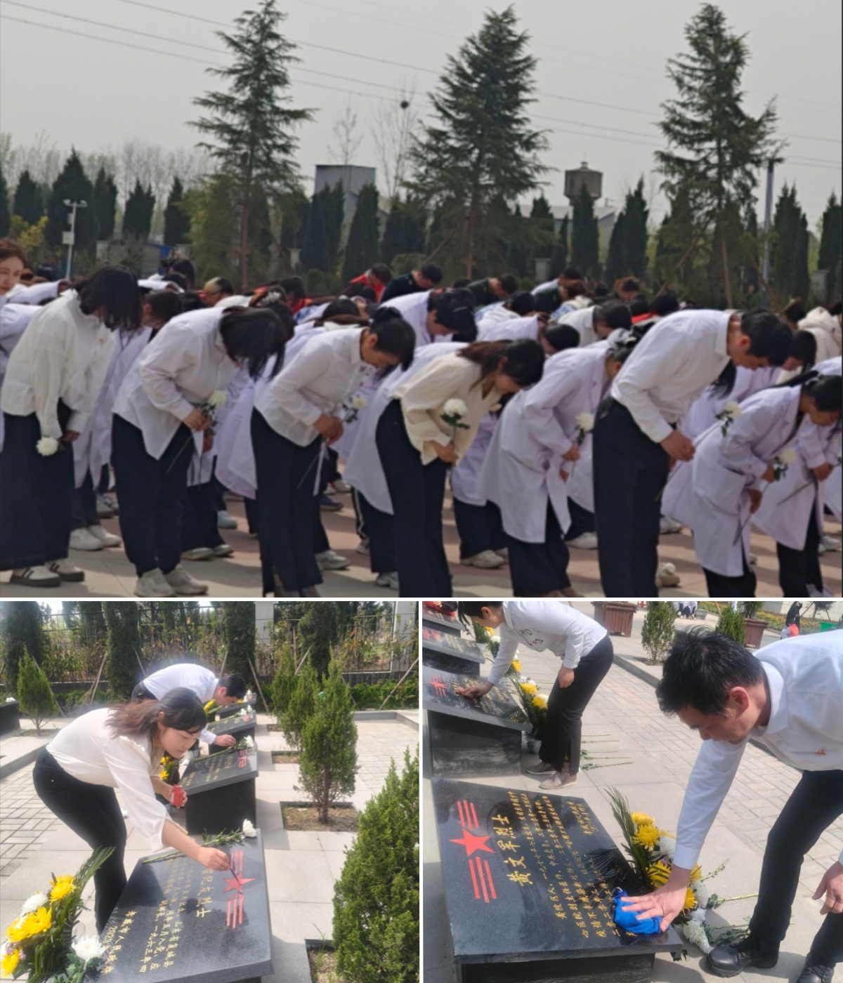 献花环节中,口腔医学院师生代表手持白菊依次绕行纪念碑,将鲜花轻轻摆放在基座前,行三鞠躬礼。随后,在烈士墓碑描金和陵园大扫除环节,口腔医学院师生分工协作,用专业工具细致清洁墓碑,为英烈擦拭丰碑。
