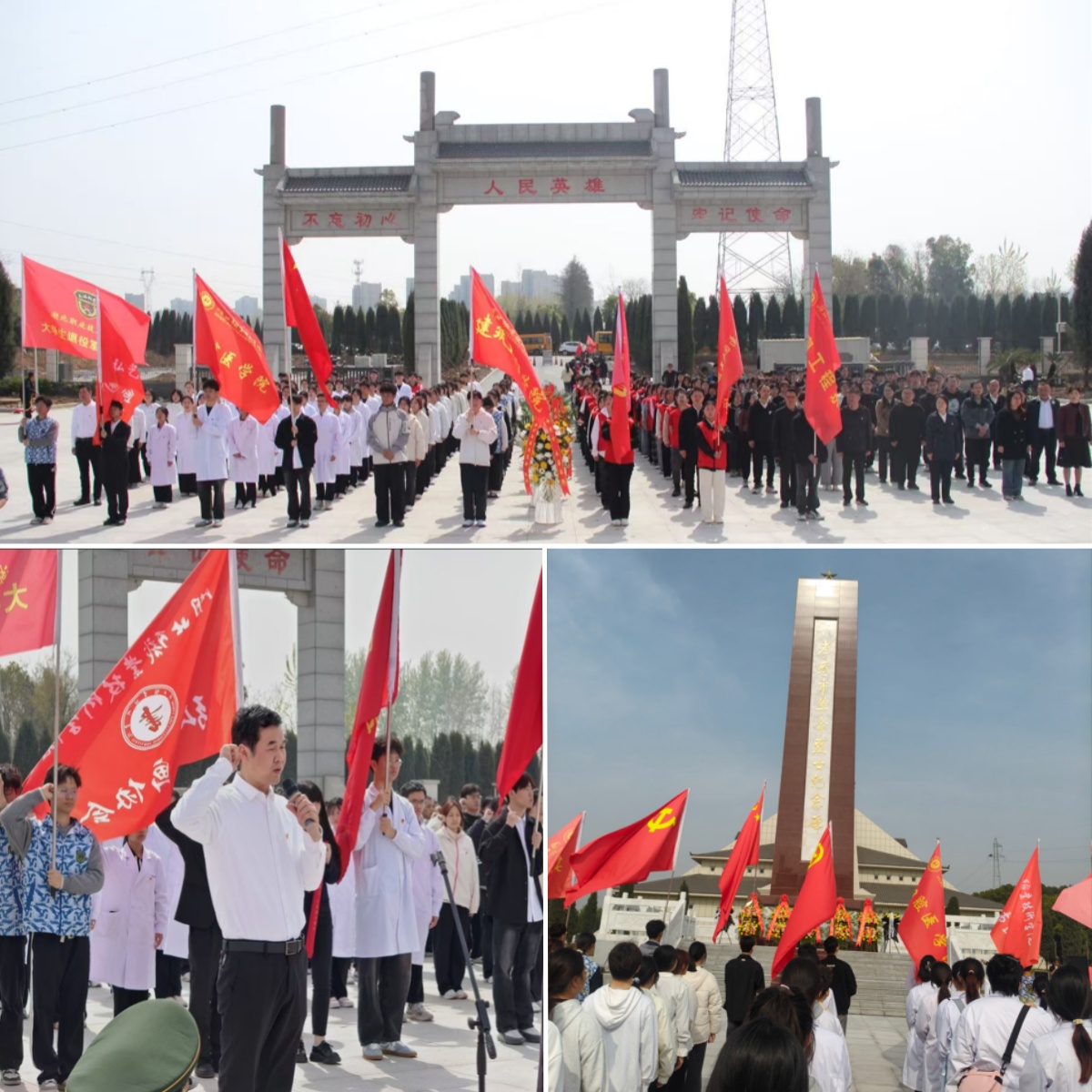 在庄严肃穆的烈士纪念碑前,我校大学生退役军人协会成员迈着整齐步伐,向革命烈士纪念碑敬献花篮。全体人员面向纪念碑三鞠躬,深切缅怀为民族独立和人民解放英勇献身的革命先烈。口腔医学院党总支书记周建平带领全体党员重温入党誓词,全体党员庄严宣誓,铿锵有力的誓言回荡在陵园上空。