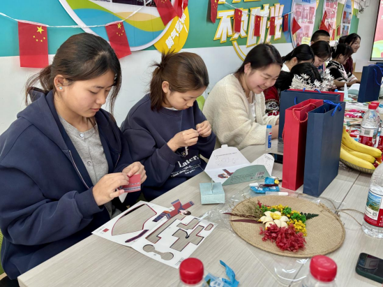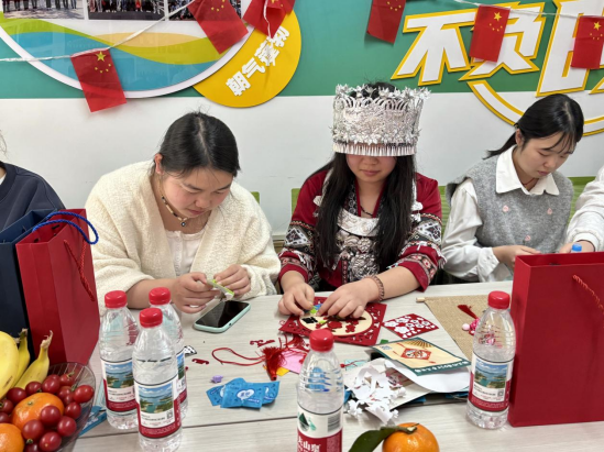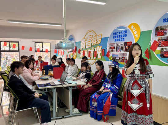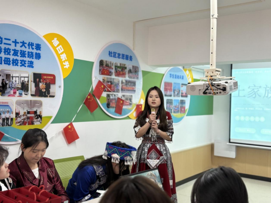 民族文化宣传片《多彩中华》,以影像语言呈现文化风貌,师生沉浸于多元文化的交融之美。手工文化作品展示环节,学生带来苗族蜡染布艺、壮族服饰折纸、苗族文化瑰宝苗绣等10余件作品。土族学生牟恩曲展示传统剪纸艺术,一幅“石榴抱籽”图案寓意各族同胞紧密相连。
