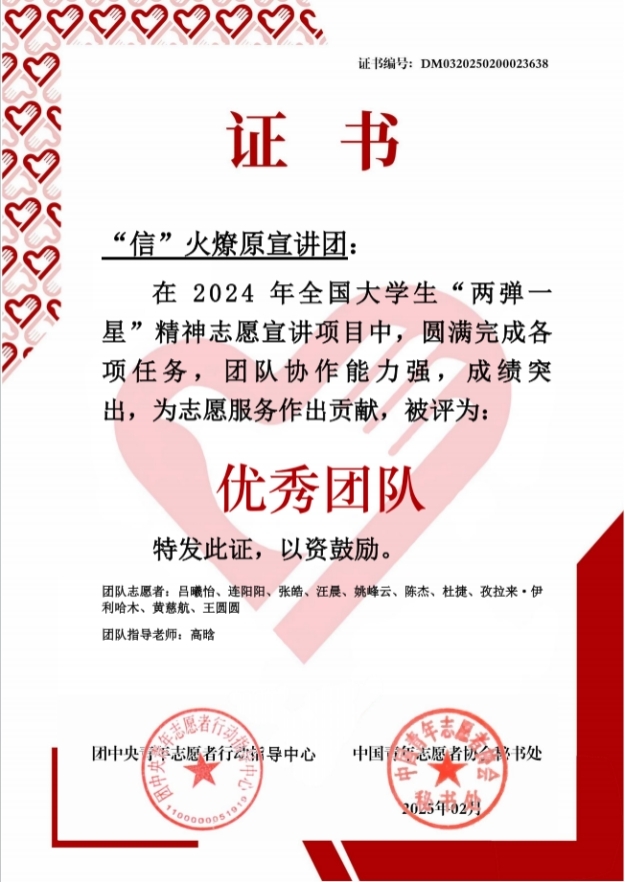 “信”火燎原宣讲团荣获2024全国大学生“两弹一星”精神志愿宣讲优秀团队