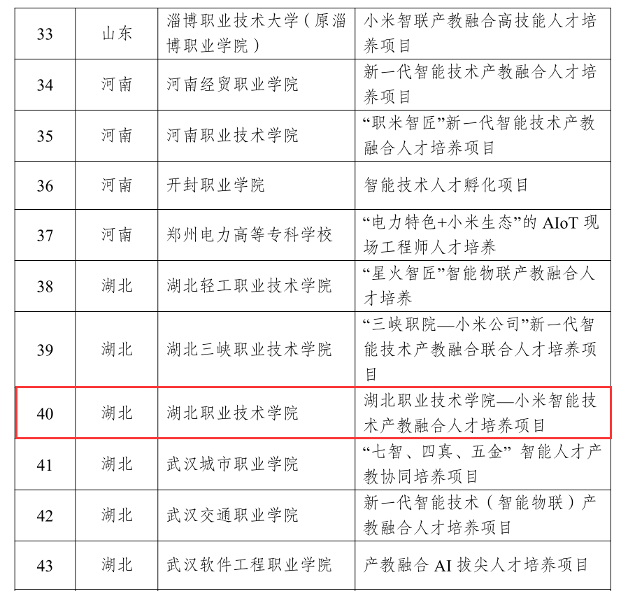 (本网讯 唐娟)近日,教育部职业教育发展中心公布了2025年度新一代智能技术产教融合促进项目入选名单,由对外合作交流处指导、信息工程学院申报的“湖北职业技术学院-小米智能技术产教融合人才培养项目”成功入选。