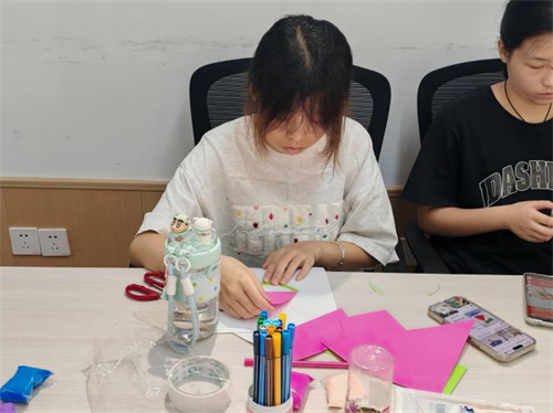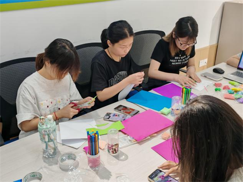 折纸教学环节,工作人员化身为耐心细致的“折纸导师”。他们现场示范“简易纸玫瑰”折法,对折纸裁剪、花瓣折叠、花茎组装等步骤逐一拆解,同时为每位参与者贴心提供图文教程卡。进入创意创作环节,彩色卡纸、丝带、亮片等装饰材料有序发放,参与者们灵感迸发,大胆设计夏日向日葵、荷花等个性花型。互助环节,同学们自由组队,在组内毫无保留地分享折纸技巧,携手合作完成“花束拼接”,在互动中增进情谊、提升协作能力。