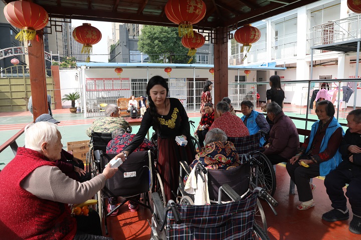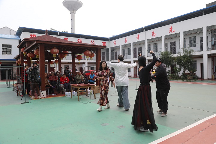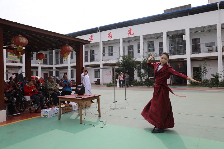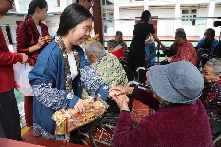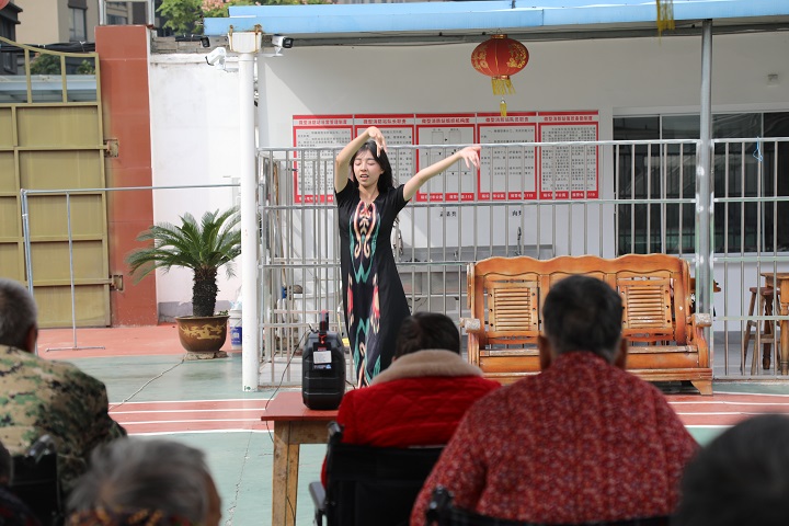 (本网讯 陈灏)孝道永流传,中华一家亲;创建文明城市,共建大美孝感。10月29日,重阳节,湖北职业技术学院石榴红志愿服务队走进孝南区城西社区福乐养老院,为60多位老人送上牛奶、面包、香蕉、桔子、柚子等,与老人聊天交流,表演精彩的文艺节目,与老人们共度传统佳节。