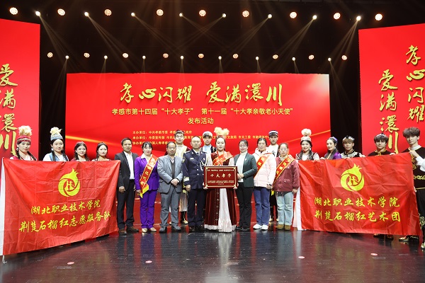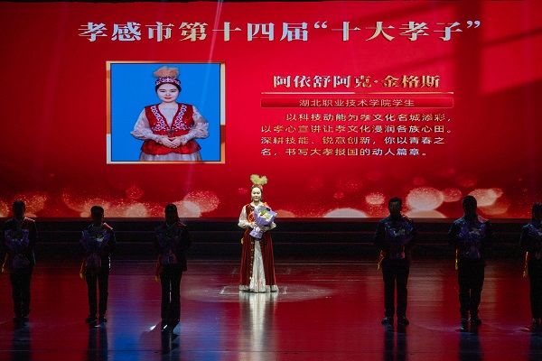 湖北职院机电工程学院2023级学生、石榴红志愿服务队副主席、荆楚石榴红宣讲团成员、石榴红•孝廉谷文化基地讲解员阿依舒阿克·金格斯荣膺孝感市第十四届“十大孝子”。湖北职院荆楚石榴红艺术团表演的节目《美丽中国》压轴登场,“湖职元素”燃爆全场,学校服务中华孝文化名城建设的支撑力、贡献度进一步彰显。