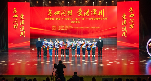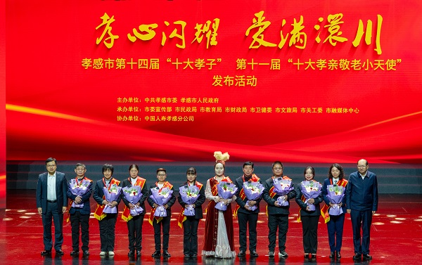(本网讯 陈灏 徐佳辉 唐熙隆 胡蝶)1月13日晚,“孝心闪耀·爱满澴川”孝感市第十四届“十大孝子”、第十一届“十大孝亲敬老小天使”发布活动,在市文化中心孝感大剧院举行。市委书记胡玖明,市委副书记、市长林中麟,市委副书记王云清,市人大常委会党组书记吴丕华,市政协党组书记刘振军出席活动。胡玖明、林中麟为“十大孝子”颁奖,吴丕华、刘振军为“十大孝亲敬老小天使”颁奖。省民政厅副厅长毕道丽,市委常委、常务副市长帅逊,副市长石必成,市关工委主任栾春海,市慈善总会会长刘洪海,市直“三区”、市直单位负责同志,往届“十大孝子”和道德模范代表,社会各界代表等参加活动。我校党委副书记王益贤,党委宣传部、统战部部长田寿永,全国道德模范谭之平,全国敬老爱老助老模范人物、湖北省道德模范李燕,全国敬老爱老助老模范人物、孝感市第十一届“十大孝子”熊文文,孝感市第十二届“十大孝子”余丽等参加活动。