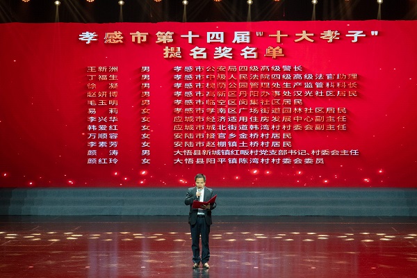 活动现场庄重而温馨。云梦县城关镇曙光社区居民龚钟山、孝昌县小悟乡项庙村村委会委员董佩杰、湖北职院2023级学生阿依舒阿克·金格斯、孝感市妇幼保健院儿科副主任刘志敏、高新区三江物业公司退休职工许亚娟、汉川市汈东街道办事处中心小学教师董又奇、安陆市经开区新河社区居民王国金、应城市黄滩镇胜利村村委会委员王翠、孝南区郝庙新村刘鲁湾居民周翠华、孝感市儿童福利院社工师王连华当选孝感市第十四届“十大孝子”。